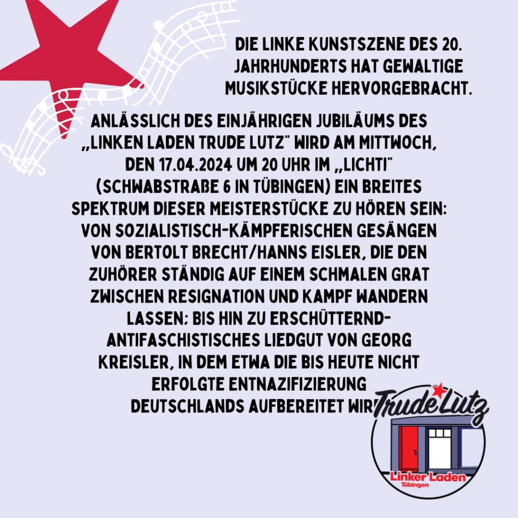 Anlässlich des ersten Jubiläums des Linken Laden Trude Lutz geht der „Politische Lieder“-Abend in die zweite Runde: Die linke Kunstszene des 20. Jahrhunderts hat gewaltige Musikstücke hervorgebracht. Von sozialistisch-kämpferischen Gesängen von Bertolt Brecht/Hanns Eisler, die den Zuhörer ständig auf einem schmalen Grat zwischen Resignation und Kampf wandern lassen bis hin zu erschütternd-antifaschistischem Liedgut von Georg Kreisler, in dem etwa die bis heute nicht erfolgte Entnazifizierung Deutschlands aufbereitet wird. Sämtliche Einnahmen gehen an den Linken Laden Trude Lutz Tübingen. Wir freuen uns auf euch!