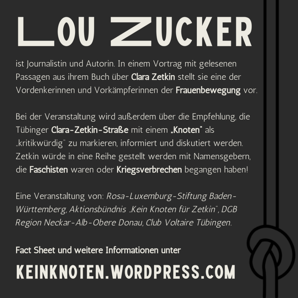 Veranstaltung von: Aktionsbündnis „Kein Knoten für Zetkin“, Rosa-Luxemburg-Stiftung Baden-Württemberg, DGB Region Neckar-Alb-Obere Donau, Club Voltaire.