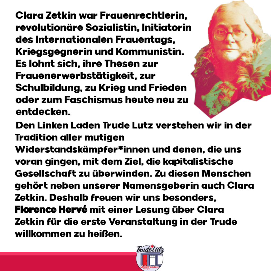 Den Linken Laden Trude Lutz verstehen wir in der Tradition aller mutigen Widerstandskämpfer*innen und denen, die vor uns voran gingen mit dem Ziel, die kapitalistische Gesellschaft zu überwinden. Zu diesen Menschen gehört neben der Namensgeberin unseres Linken Ladens natürlich auch Clara Zetkin. Deshalb freuen wir uns besonders, Florence Hervé mit einer Lesung über Clara Zetkin für unsere erste Veranstaltung in der Trude willkommen zu heißen.