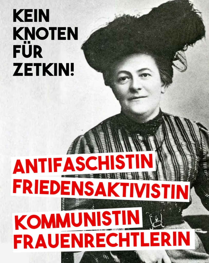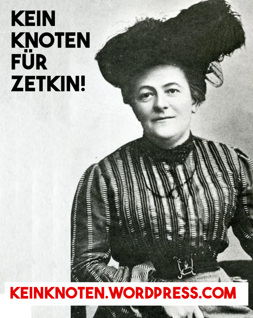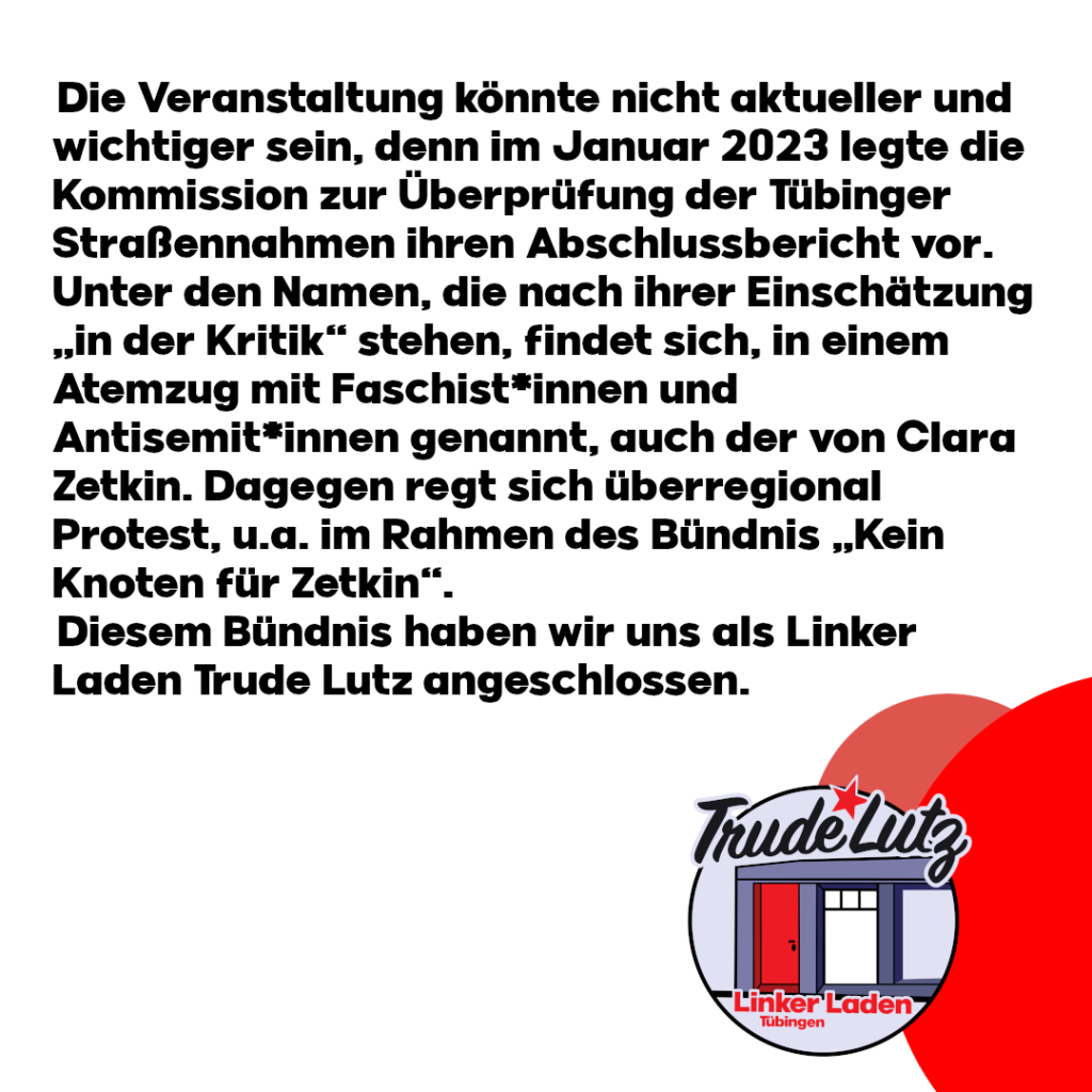 Trotz Ausschluss aus dem allgemeinen Erinnerungskanon hallt der Name Clara Zetkins aus dem vergangenen Jahrhundert herüber und signalisiert immer noch eines: Widerstand. Dafür wird sie von den einen abgelehnt, von den anderen geliebt. Das führt uns die aktuelle Debatte in Tübingen rund um die Clara Zetkin Straße deutlich vor. Die Veranstaltung könnte also nicht aktueller und wichtiger sein, denn im Januar 2023 legte die Kommission zur Überprüfung der Tübinger Straßennahmen ihren Abschlussbericht vor. Unter den Namen, die nach ihrer Einschätzung „in der Kritik“ stehen, findet sich, in einem Atemzug mit Faschist*innen und Antisemit*innen genannt, auch der von Clara Zetkin. Dagegen regt sich überregional Protest, u.a. im Rahmen des Bündnis „Kein Knoten für Zetkin“. Diesem Bündnis haben wir uns als Linker Laden Trude Lutz angeschlossen.