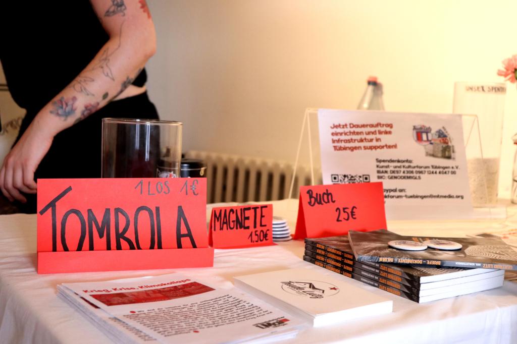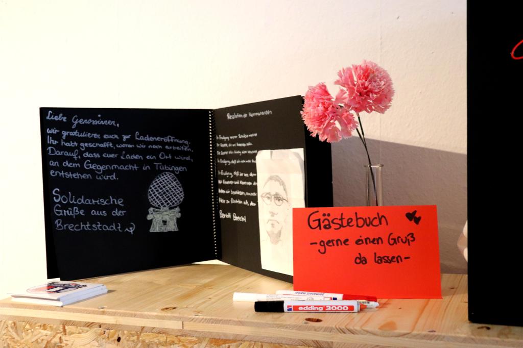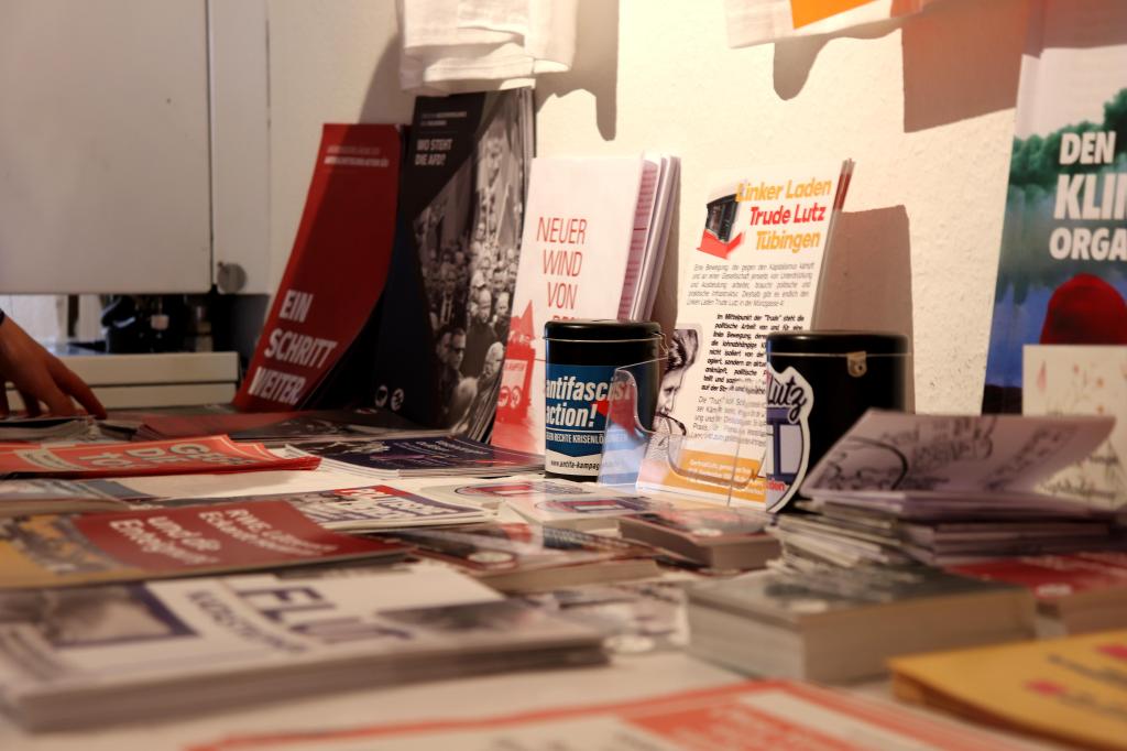 Wer eine ausführliche Vorstellung des Projekts vermisst hat, kam hoffentlich bei unserer Eröffnungsrede ein wenig auf seine Kosten – danach haben wir gemeinsam angestoßen und den Laden offiziell eröffnet. Wir haben uns unglaublich gefreut über die vielen Glückwünsche und Reden – und nicht zu vergessen die tollen Geschenke – die Linke Zentren aus Süddeutschland und auch Linke Gruppen aus Tübingen vorgetragen und uns überreicht haben. Wir sind jetzt um einen Beamer, einen Aktenschredder, spannende Bücher, viel politische Wanddekoration und auch den ein oder anderen edlen Tropfen (aus BaWü und der Pfalz!) reicher. An dieser Stellen wollen wir uns dafür nochmal herzlich bei Euch bedanken!