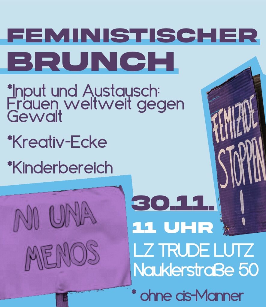 Am 25.11. ist jedes Jahr der Internationale Tag gegen patriarchale Gewalt. Am Sonntag danach wollen wir zusammenkommen, diskutieren und uns stärken. Euch erwartet ein kleiner Input, wie Frauen und FLINTA weltweit gegen Gewalt aktiv sind – zudem viel gutes Essen und Raum für Austausch. Der Brunch findet ab 11 Uhr statt. Kinder sind herzlich willkommen!